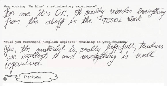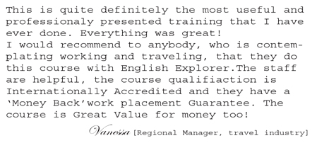 Below are just a few of the hundreds of endorsements that we have from well satisfied English Explorer graduates of our Professional TESOL Certificate who are travelling and teaching around the world right now. Why not train with us and join them? Remember that we give you a money back guarantee of finding a posting. See our website for details and also to enrol. Remember when enrolling and paying on line, that you must complete ALL of the boxes. Allow us five working days after enrolment to clear your payment and process your passwords etc.